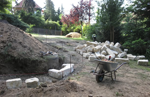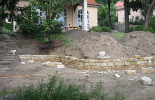 Bau einer Trockenmauer aus ortstypischem Sandstein.